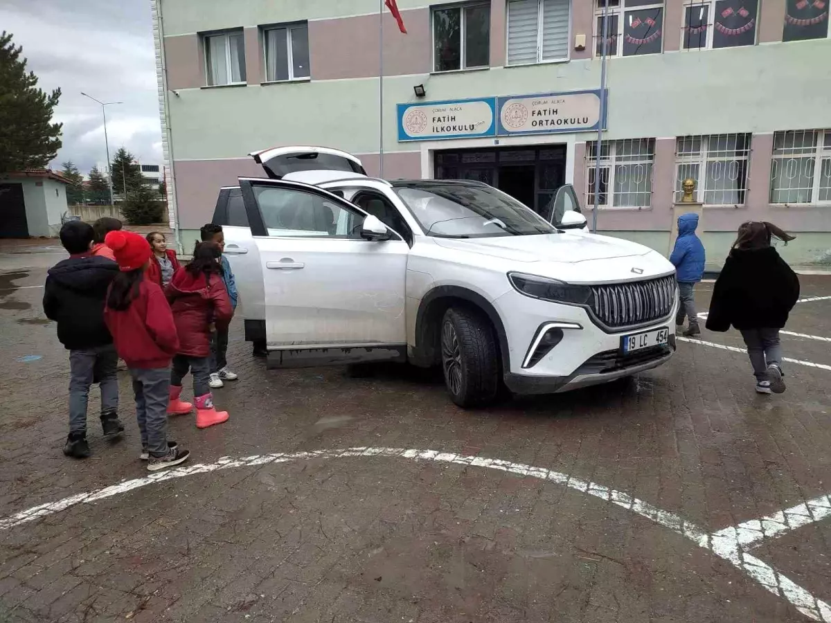 Çorum'un Alaca ilçesinde Yerli Malı Haftası'nda ilkokul öğrencileri, Togg'u yakından görmek fırsatı buluncu büyük sevinç yaşadı.