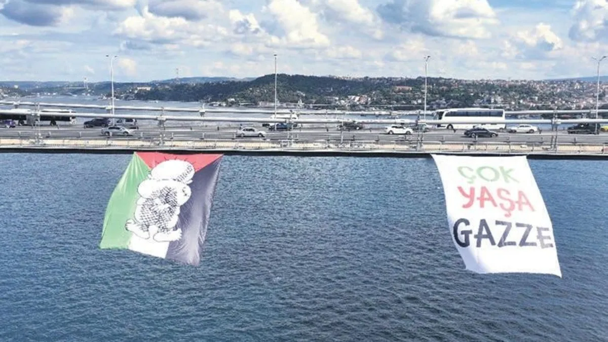 Yeni Sanat Vakfı, İsrail’in Gazze’de uyguladığı soykırıma dikkat çekmek için, 15 Temmuz Şehitler Köprüsü’ne Hanzala çizimli pankart ve bayrak astı. Her gün binlerce aracın geçtiği köprüye 12X18 boyutlarında asılan bayrak, vatandaşların dikkatini çekiyor. Konuya ilişkin basın mensuplarına açıklamada bulunan Vakıf Başkanı, karikatürist ve oyuncu Hasan Kaçan, “Yaklaşık bir yıla yakın süredir Siyonist rejim, Gazze’de masumları, çocukları, yaşlıları, nefes alan neredeyse her türlü canlıyı korkunç bir şekilde öldürüyor. Bu süre içerisinde 40 bin insan öldürüldü. Bizler sanatçısından, esnafına kadar hepimiz Gazze’de yapılan bu korkunç soykırıma karşı durmak zorundayız.” dedi. Kaçan, bu soykırımın unutulmaması adına elden ne geliyorsa yapılması gerektiğinin altını çizerek, şunları kaydetti:
