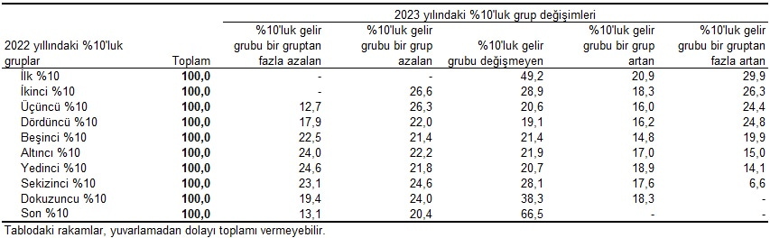 Eşdeğer hanehalkı kullanılabilir fert gelirine göre sıralı %10’luk gelir grupları itibarıyla fertlerin bir önceki yıla göre yüzdelik geçişleri incelendiğinde; bir önceki yılda birinci %10’luk grupta olan fertlerin 2023 yılında %49,2’sinin, son %10’luk grupta olan fertlerin ise %66,5’inin gelir grubu değişmedi. Ayrıca 2022 yılında birinci %10’luk grupta olan fertlerin %29,9’unun 2023 yılında gelir grubu birden fazla yükseldi. Son %10’luk grupta olan fertlerin ise %13,1’inin gelir grubu birden fazla düştü.