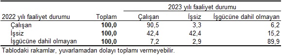 Gelir ve Yaşam Koşulları Araştırması panel veriden elde edilen sonuçlara göre 2022 yılında işsiz olan fertlerin %42,4’ü 2023 yılında çalışmaya başladı. Faaliyet durumu 2022 yılında çalışan olarak belirlenen fertlerin 2023 yılında %90,5’i çalışma hayatına devam etti. Bir önceki yıl işgücüne dahil olmayan fertlerin ise %10,1’i işgücüne katıldı.