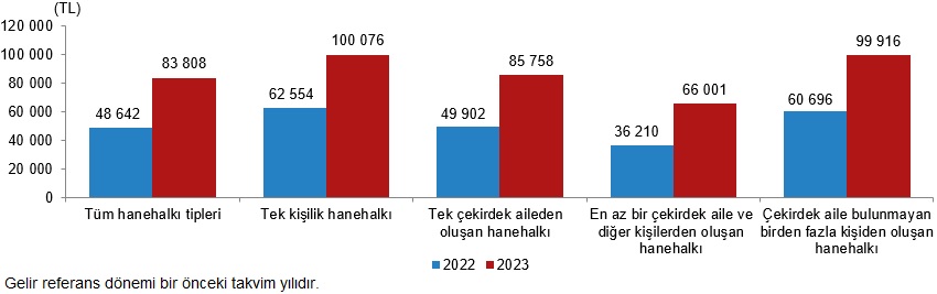 Yıllık ortalama eşdeğer hanehalkı kullanılabilir fert gelirlerinde en yüksek gelir, geçen yıla göre 37 bin 522 TL artarak 100 bin 076 TL ile tek kişilik hanehalklarının oldu. Çekirdek aile bulunmayan birden fazla kişiden oluşan hanehalklarının yıllık ortalama eşdeğer hanehalkı kullanılabilir fert geliri 99 bin 916 TL iken tek çekirdek aileden oluşan hanehalklarında bu değer 85 bin 758 TL oldu. En düşük yıllık ortalama eşdeğer kullanılabilir hanehalkı fert gelirine sahip hanehalkı tipi ise 66 bin 001 TL ile en az bir çekirdek aile ve diğer kişilerden oluşan hanehalkları oldu.