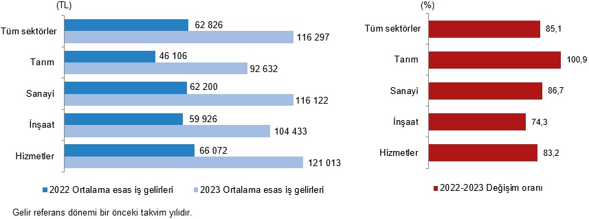 Esas iş gelirleri sektörel ayrımda incelendiğinde; en yüksek yıllık ortalama gelirin 121 bin 013 TL ile hizmet sektöründe, en düşük yıllık ortalama gelirin ise 92 bin 632 TL ile tarım sektöründe olduğu görüldü. Bir önceki yıla göre; yıllık ortalama esas iş gelirinde en yüksek artış %100,9 ile tarım sektöründe gözlenirken, bunu %86,7 ile sanayi sektörü izledi. Diğer taraftan hizmet sektöründe %83,2, inşaat sektöründe ise %74,3 artış gözlendi.