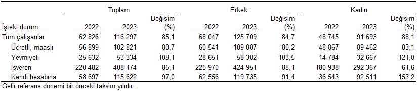 Yıllık ortalama esas iş gelirleri sırasıyla işverenlerde 408 bin 174 TL, kendi hesabına çalışanlarda 115 bin 622 TL, ücretli maaşlılarda 102 bin 821 TL ve yevmiyelilerde 53 bin 334 TL olarak hesaplandı. Geçen yıla göre en yüksek artış %108,1 ile yevmiyelilerde, en düşük artış ise %80,7 ile ücretli maaşlılarda oldu.